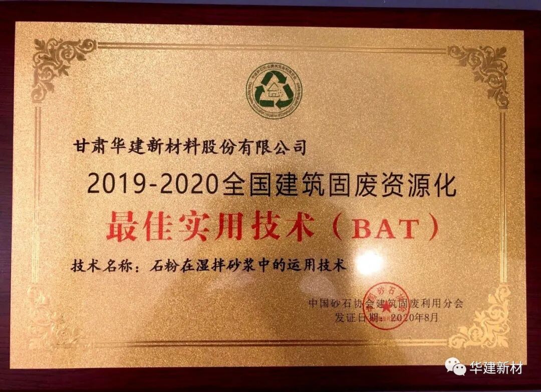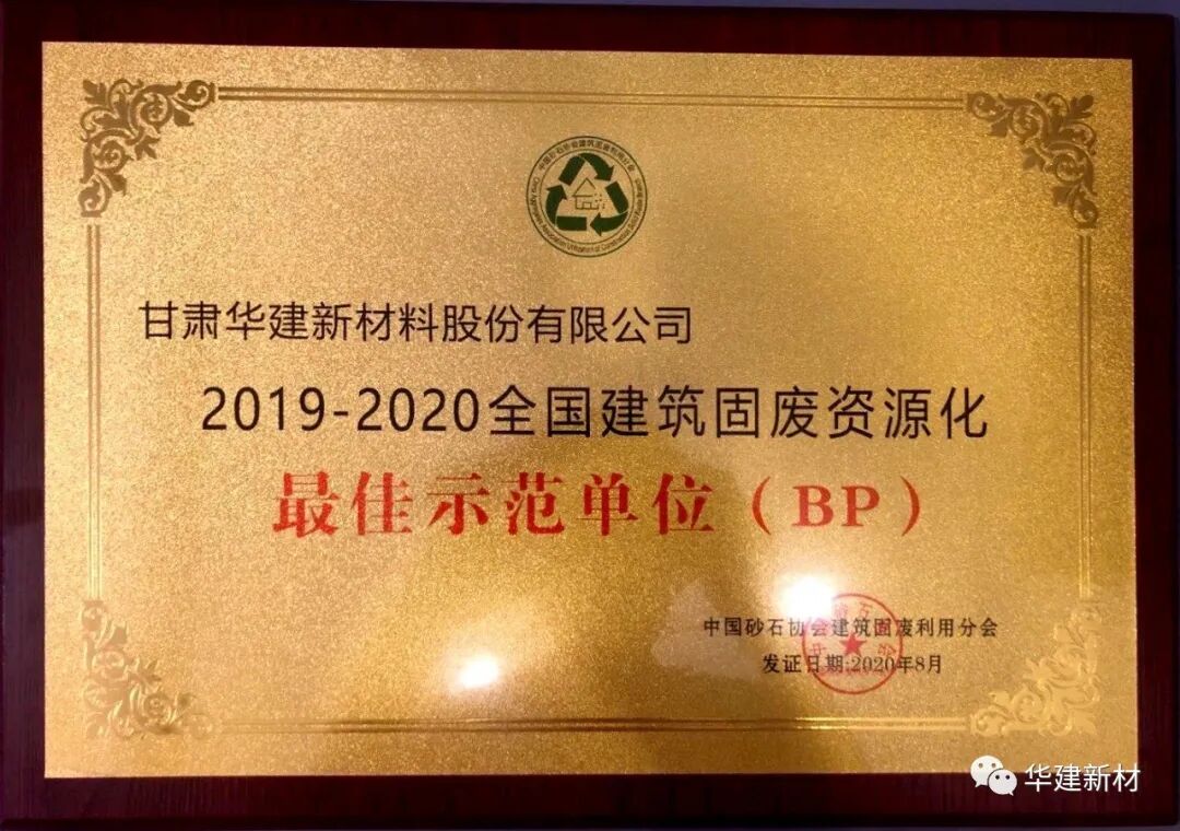 甘肅華建新材料股份有限公司榮獲"全國建筑固廢資源化最佳實用技術(BAT)"和“全國建筑固廢資源化最佳示范企業(BP)”稱號